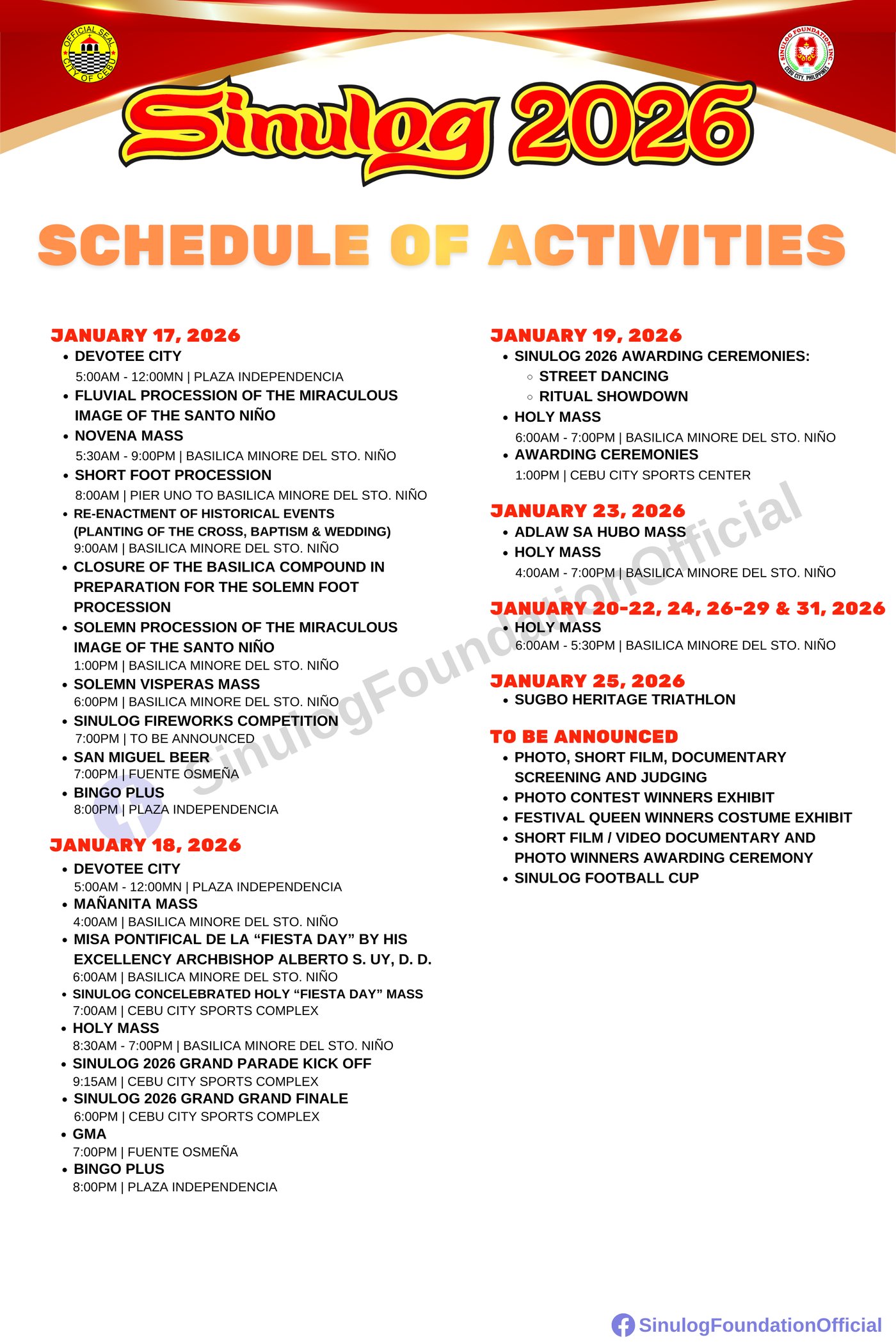 Sinulog 2026 Schedule of Activities